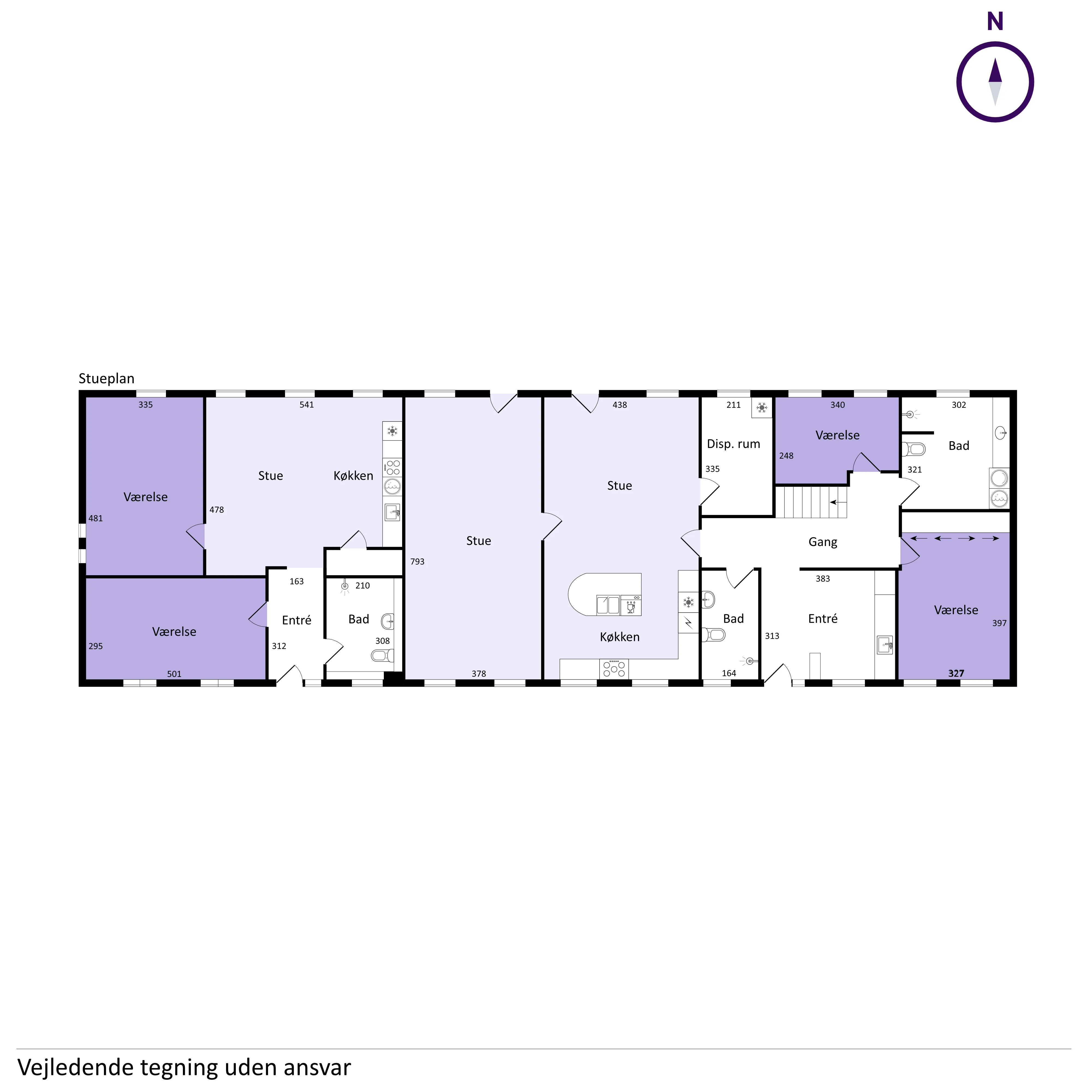 Ejendommen byder på rummelige opholdsområder med otte værelser, herunder fem soveværelser og to badeværelser i hovedhuset. En gæstelejlighed med yderligere to soveværelser og et badeværelse. Gulvvarme er installeret i gæstelejligheden, og både lofter og gulvisolering er fornyet. Badeværelset i gæstelejligheden har fået nyere fliser, og vandrør samt elektriske ledninger er fornyet. Derudover er gæstelejligheden fuld møbleret, hvor hoved lejligheden er delvist møbleret.