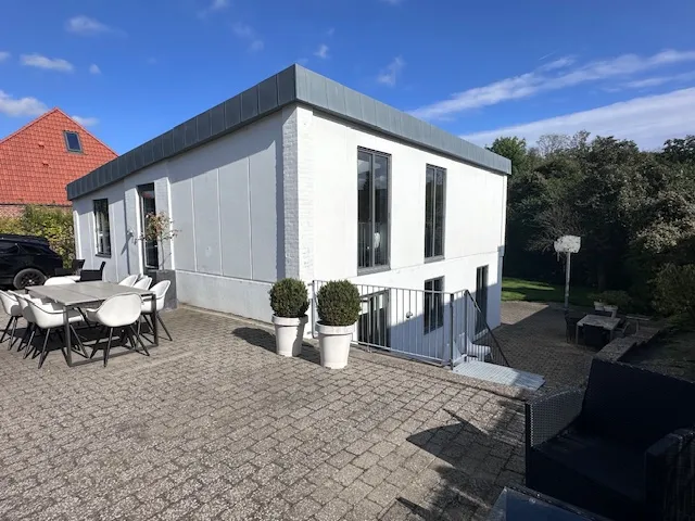 Speciel, stor hvid villa i funkisstil. Bygget 1958, hovedombygning 2006, løbende renoveret derefter. Nyere badeværelser med berøringsfri armaturer og Duravit/ Philippe Starck sanitet.