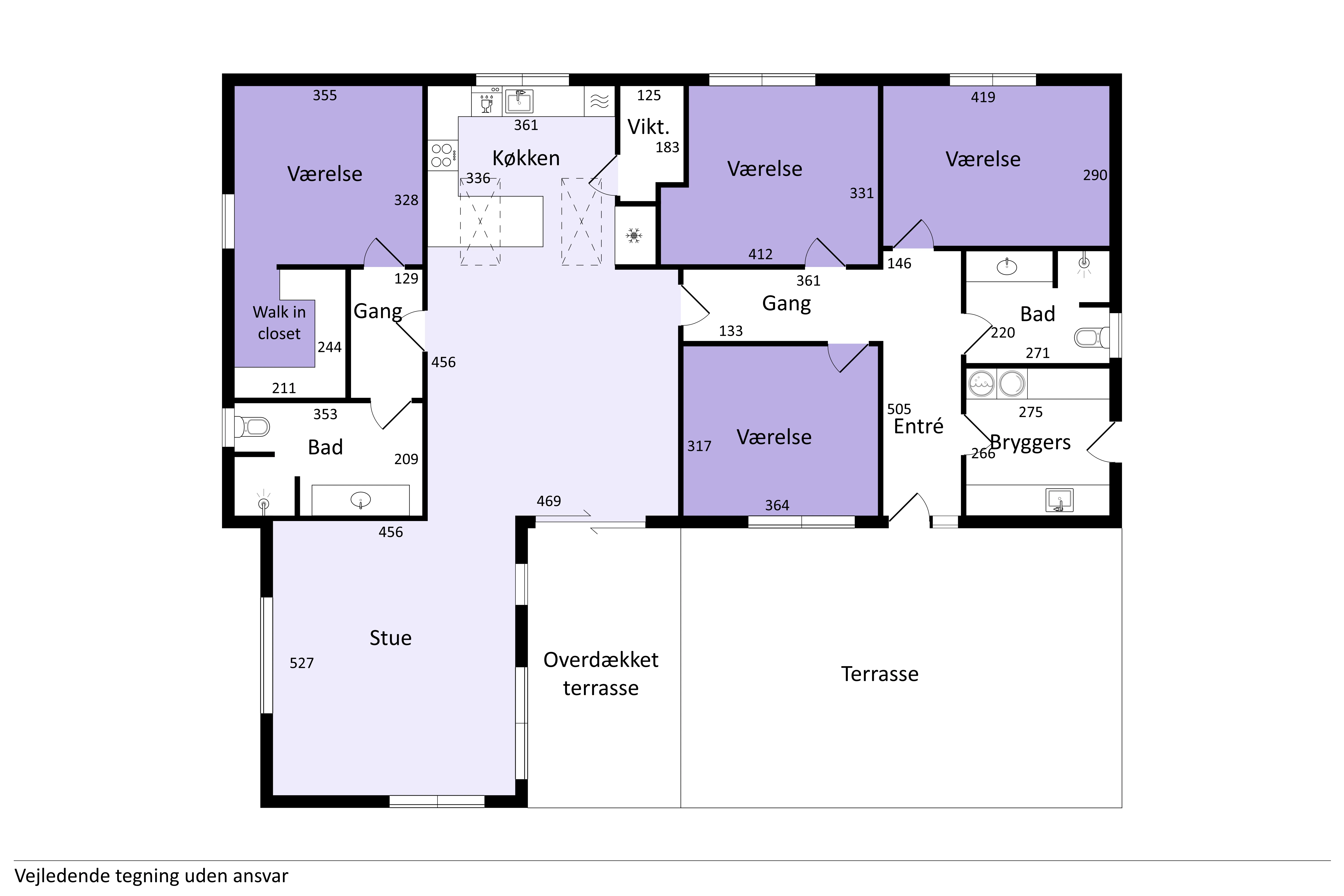 Huset er smart designet med en entre, der fungerer som en fordelingsgang, hvilket giver nem adgang til alle dele af hjemmet. Her finder du et praktisk bryggers, ideelt til hverdagens gøremål. Der er to badeværelser, hvilket sikrer, at morgenrutinerne forløber gnidningsfrit for hele familien. De fire værelser giver rigelig plads til både børn og gæster, og kan let tilpasses til kontor eller hobbyrum efter behov.