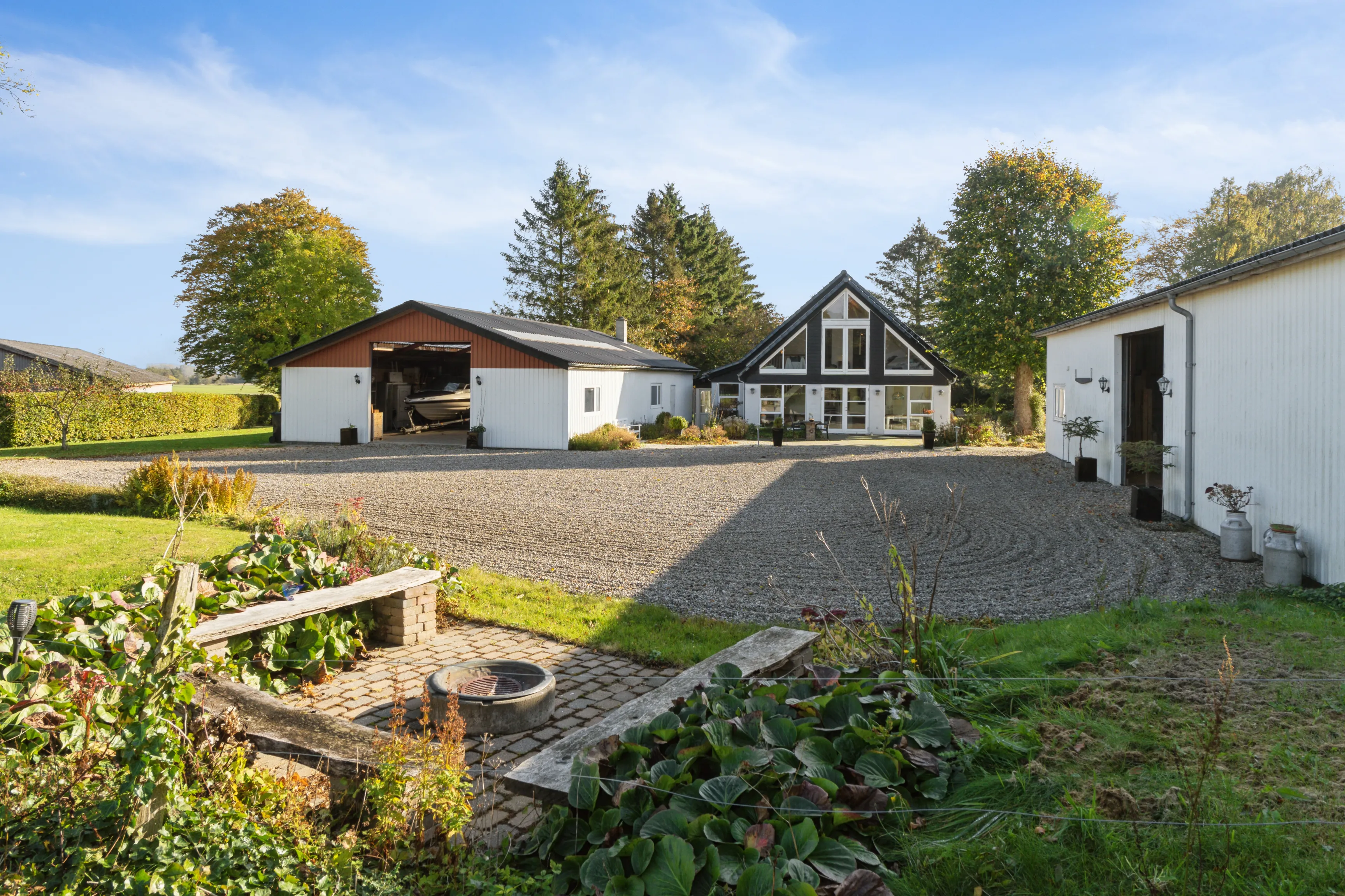Det store maskinhus giver plads diverse fritidsinteresser. I den lille stålhal er der værksted og et fyrrum med et pillefyr samt brændekedel.