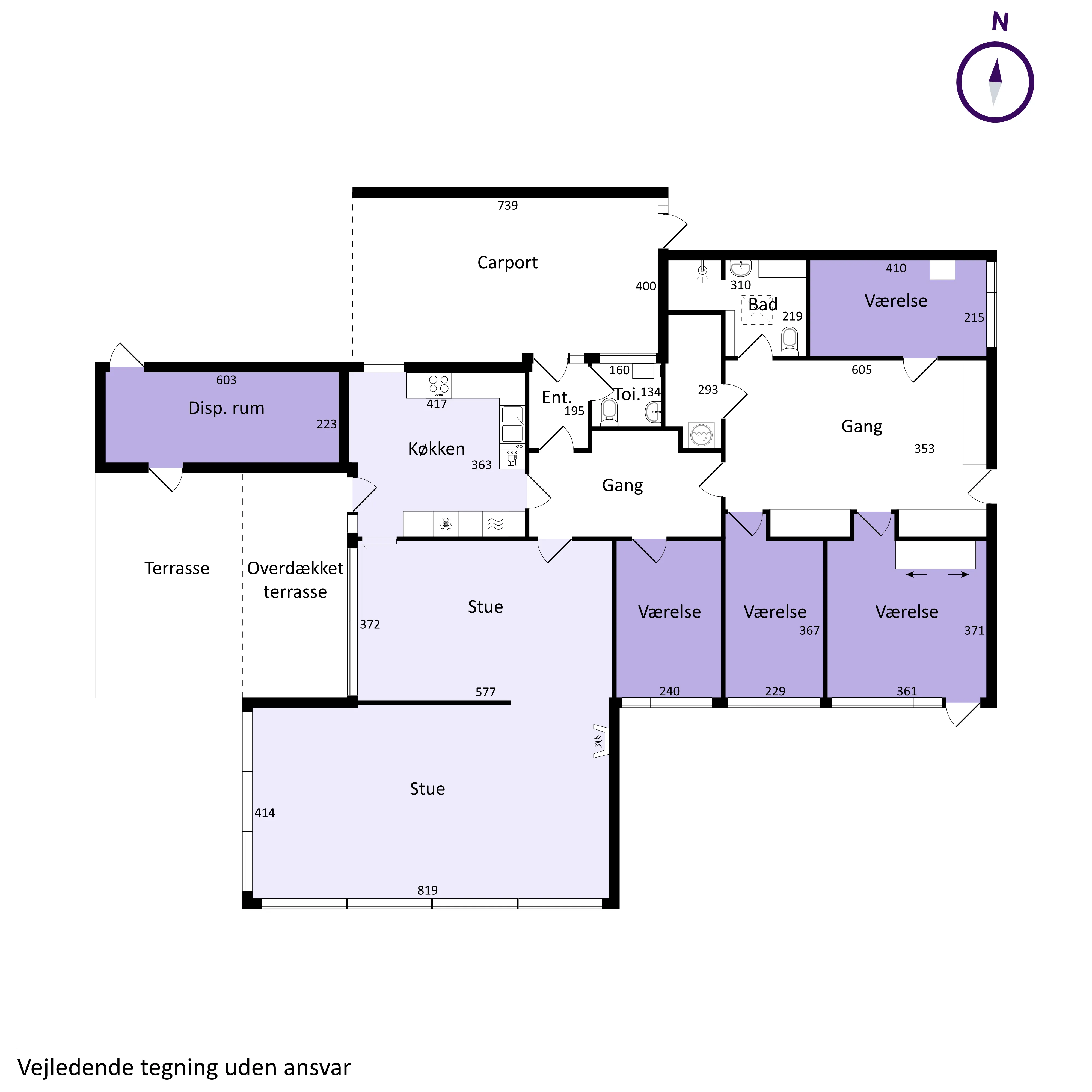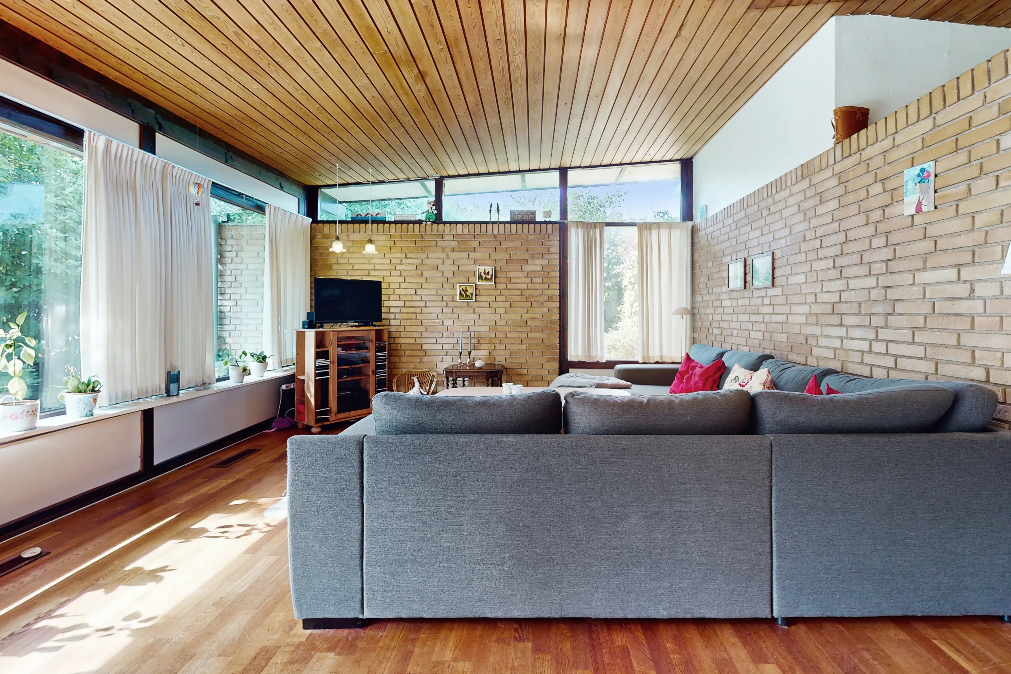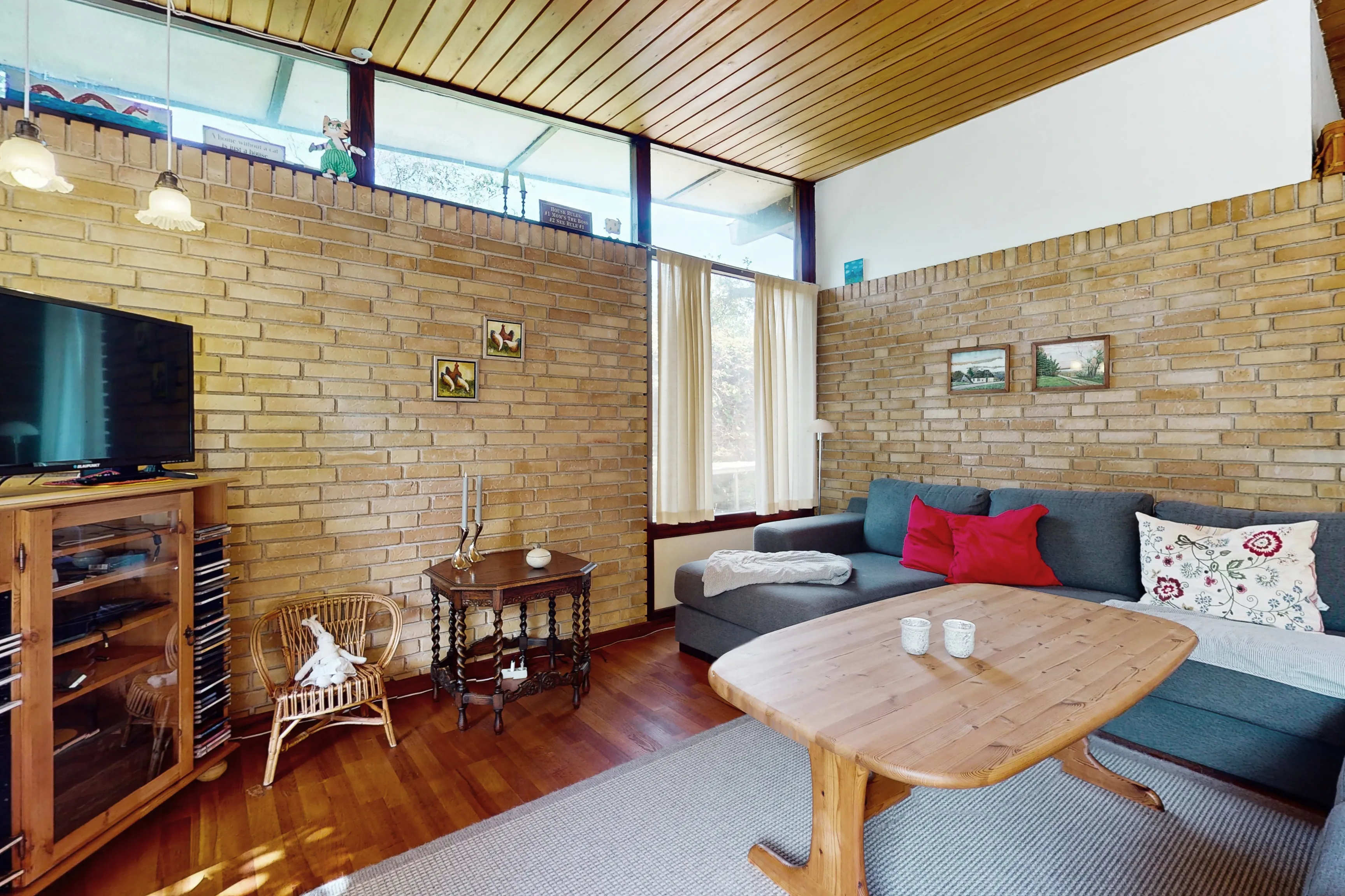 Med bilen parkeret i carporten når I tørfodede indenfor i entréen med plads til overtøj og adgang til gæstetoilet samt gang. Gangen fører jer ind i den dejlige, lyse stue med nydelige trælofter og en murstensvæg, der fortsætter udenfor og giver prikken over i'et for den spændende arkitektur. Rummets skønne lysindfald sikrer god plads til at skabe hyggelige stunder omkring spisebordet samt i opholdsstuen. I har også udgang til den hyggelige overdækkede terrasse i den charmerende gårdhave, der fører jer videre til haven i biodiversitetens tegn med vilde blomster, insekter og dyr. Ved siden af stuen er det velholdte, klassiske spisekøkken med flot opbevarings- og bordplads. I villaen finder I hele 4 gode værelser, så her får I perfekt plads til (børne)værelser, hjemmekontor, master bedroom eller noget helt fjerde. Endvidere et badeværelse med brus og ovenlysvindue, et stort gangareal med gode anvendelses- og opbevaringsmuligheder samt et vaske-/viktualierum.