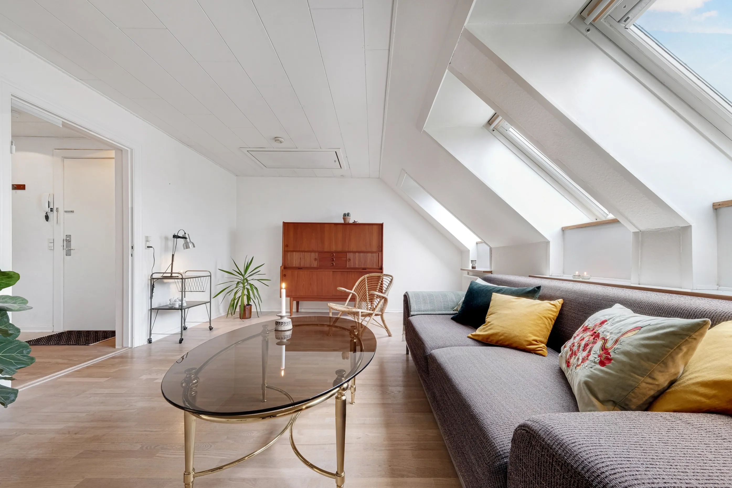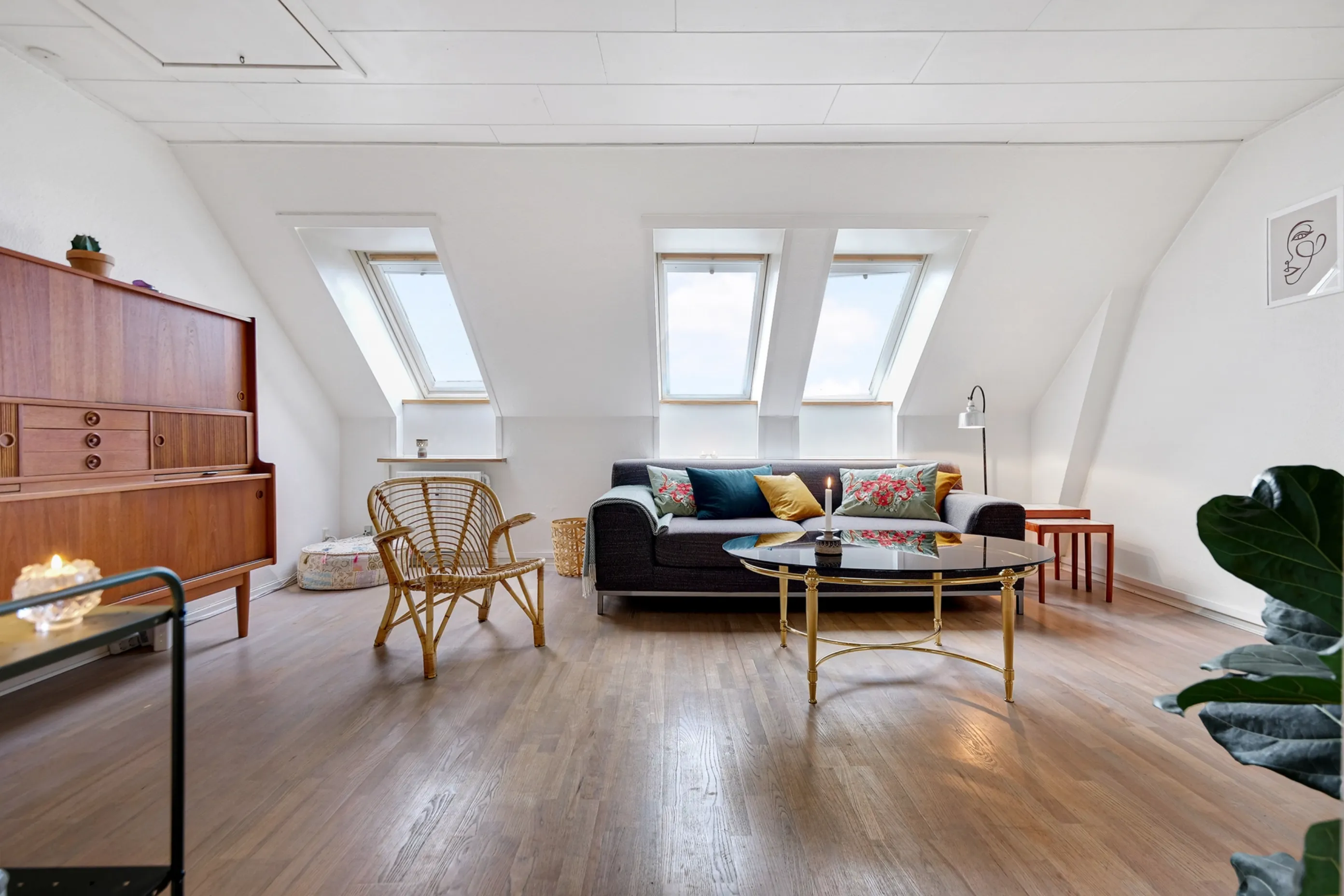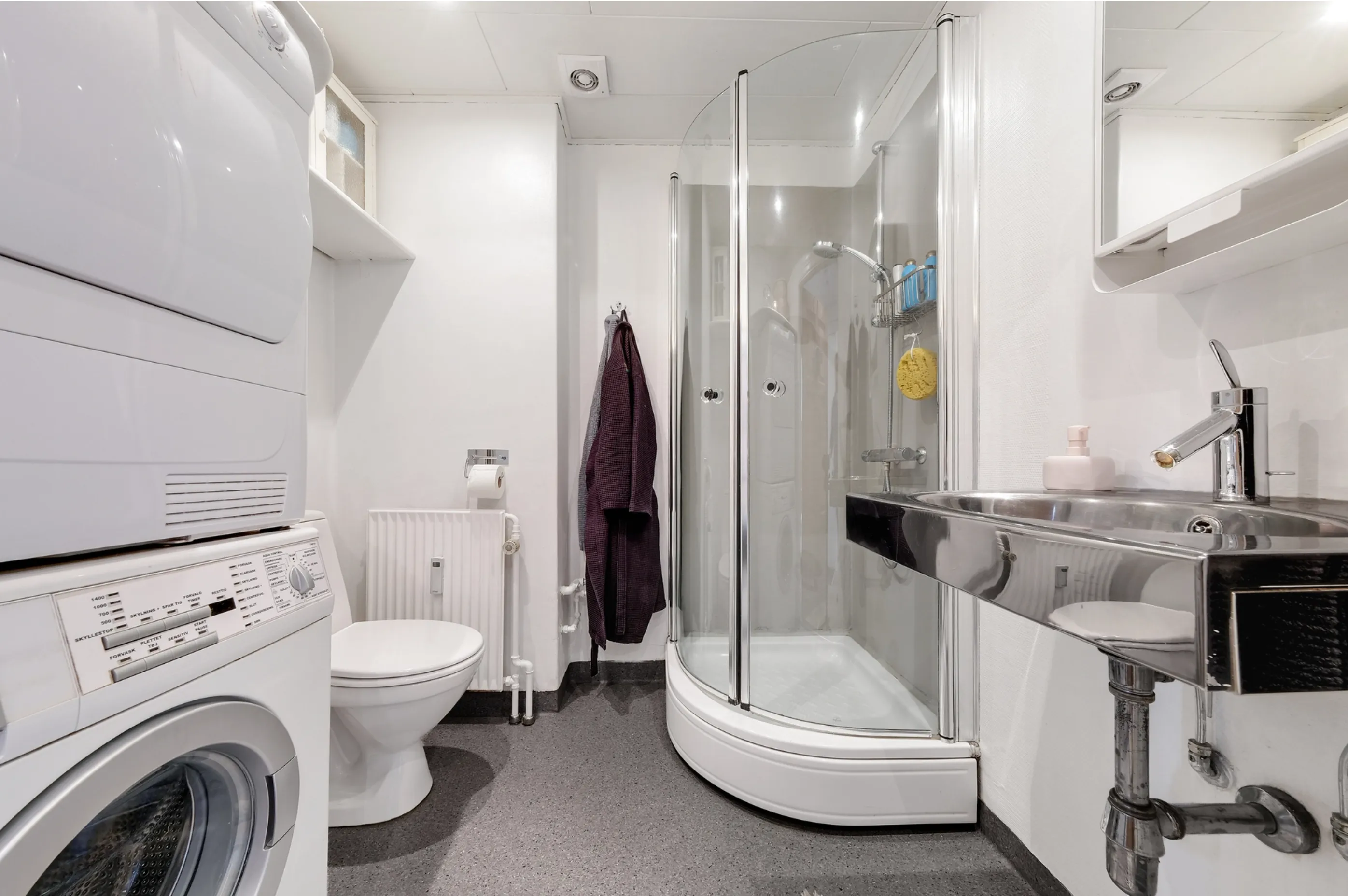 Lejlighedens velindrettede kvadratmeter fordeler sig på entre, soveværelse, badeværelse køkken med spiseplads og stue. Til lejligheden er desuden et stort loftrum, der enten kan benyttes som kontor eller til ekstra opbevaringsplads. Planløsningen er meget delevenlig, så hvis I ikke ønsker at etablere en stue og et soveværelse, kan I hver få et værelse i hver sin ende af lejligheden. Spisekøkkenet med naturlig ovenlys er beklædt i overflader af træ, der gemmer på de velplacerede hvidevarer samt nogle af rummets opbevaringsløsninger. Køkkenet er godt udnyttet med skabe fra gulv til loft langs den ene væg. Lejlighedens store badeværelse rummer alle nødvendige funktioner; en separat brusekabine samt vaskesøjle med vaskemaskine og tørretumbler, så I slipper for at rende op og ned ad trapper med vasketøj.